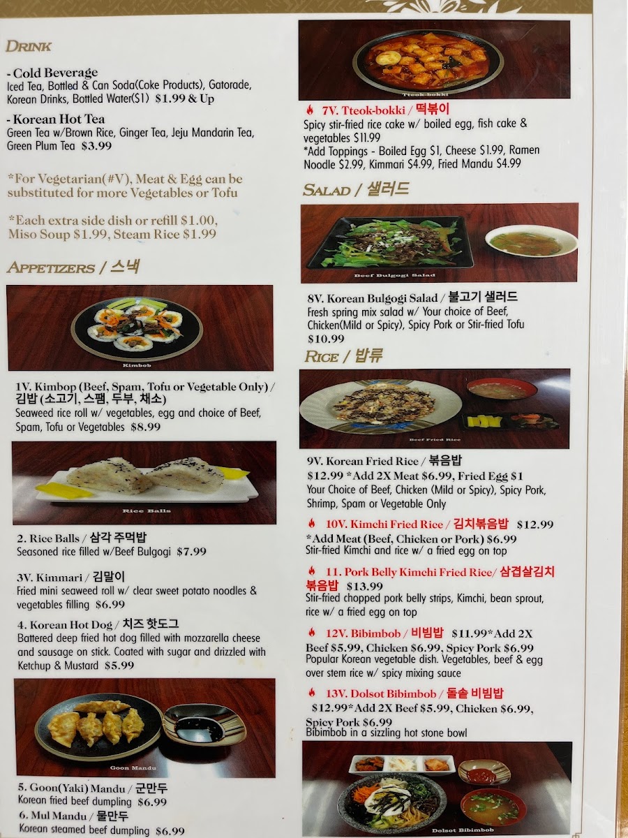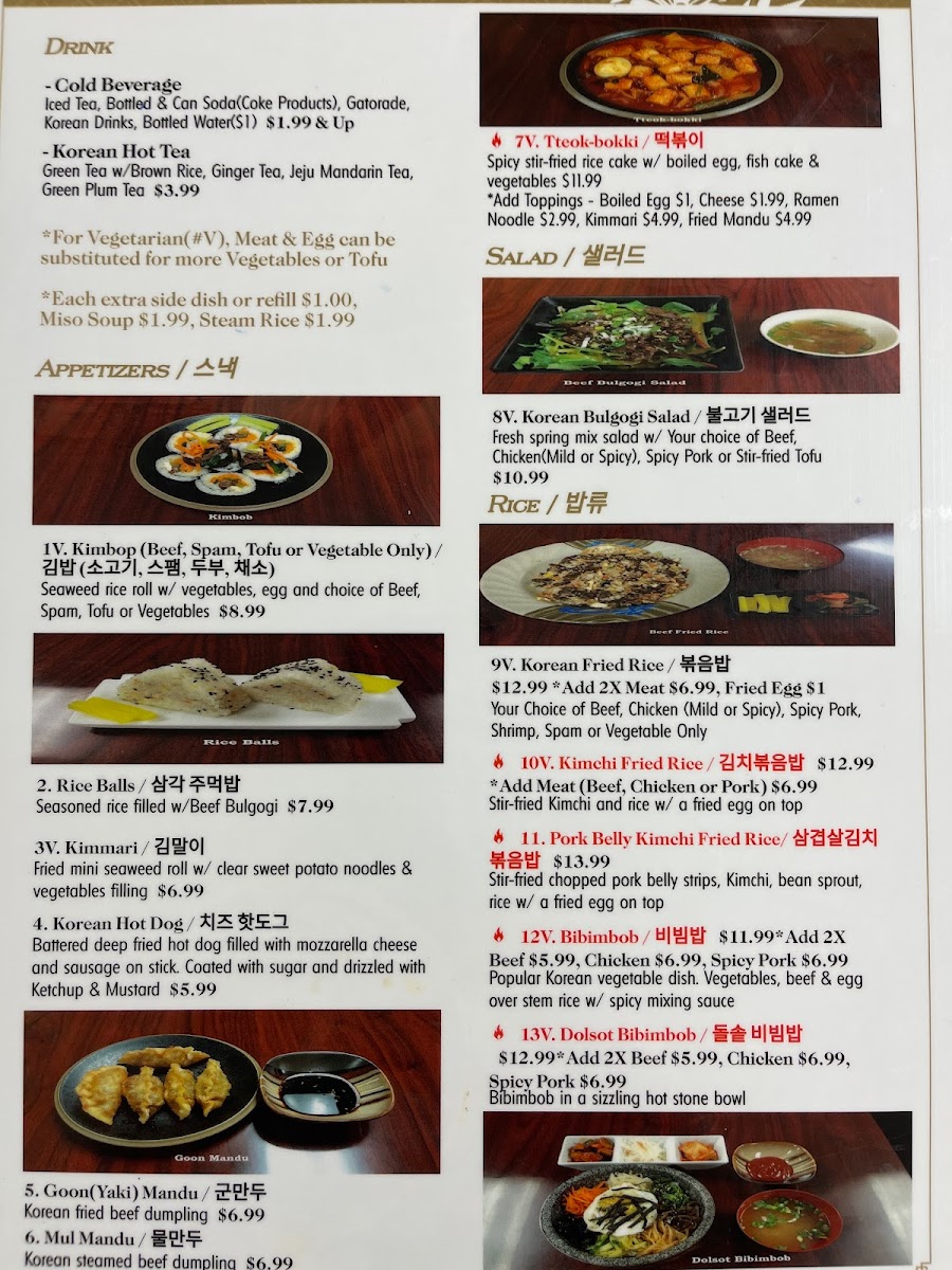 Start your culinary journey with tantalizing appetizers like Kimchi Rice Balls filled with savory cheese, or the crunchy Goon Yaki Mandu beef dumplings that are fried to perfection. For sides, indulge in classic Cucumber Kimchi or comfort in a warm Miso Soup.